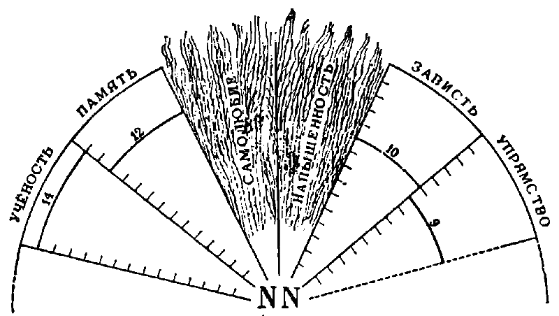 Дополненная эта фигура может дать вам довольно ясное и точное понятие о способностях N. N. Вы увидите, что при всей хитрости и остроте своей он часто должен ошибаться по недостатку здравого рассудка и сметливости. При взгляде на чрезмерное количество самолюбия, напыщенности и нераздельного с ними упрямства вам не покажется удивительным, что три эти качества, составляющие в сложности 35 градусов, во всех случаях будут превозмогать здравый рассудок, проницательность, понятливость и сметливость N. N., которых у него всего-на-все только 14 градусов.