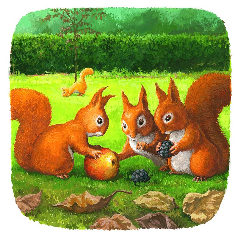 Они нашли приют в саду, но поздней осенью здесь еды не густо, полакомиться нечем – разве что закатившимся в траву яблочком. На ветках плодовых деревьев пусто. Беднягам нечего погрызть, ни тебе орешка, ни еловой шишечки. Что за жизнь! Вот если бы вернуться в родные места! Но там, в лесу, засела серая орда.