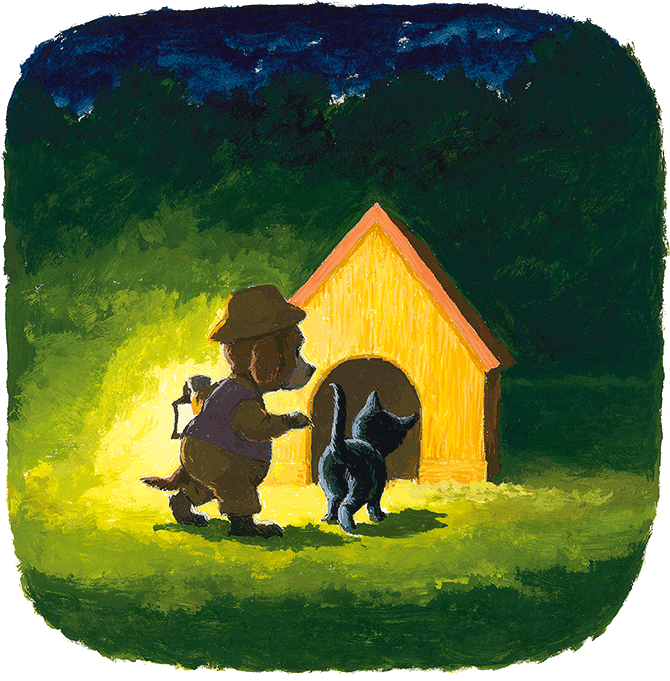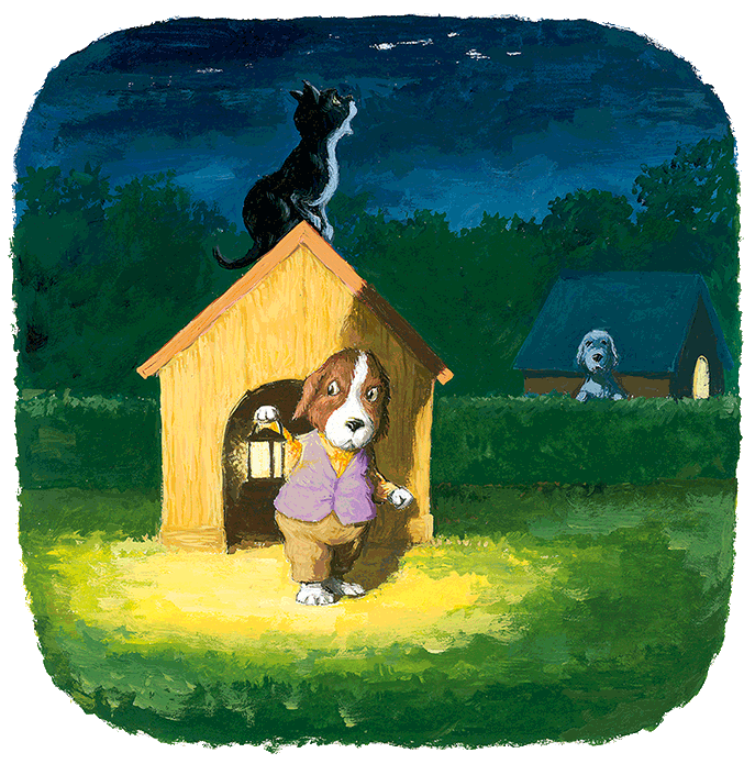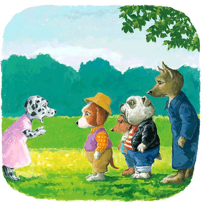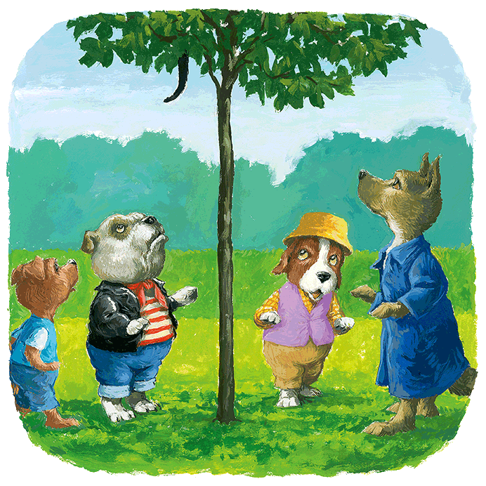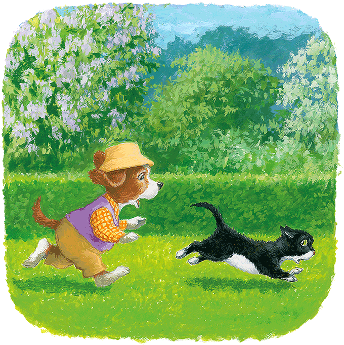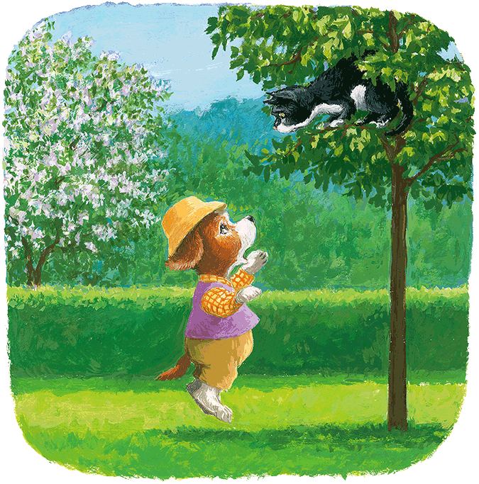 – Я больше в жизни никогда не трону кошку! – клянётся пёс. – Кусты, цветы, дорожки – всё твоё. Пусть малыши, пока растут, гуляют тут. Отныне мы с тобой друзья. Вот тебе честное пёсье слово!