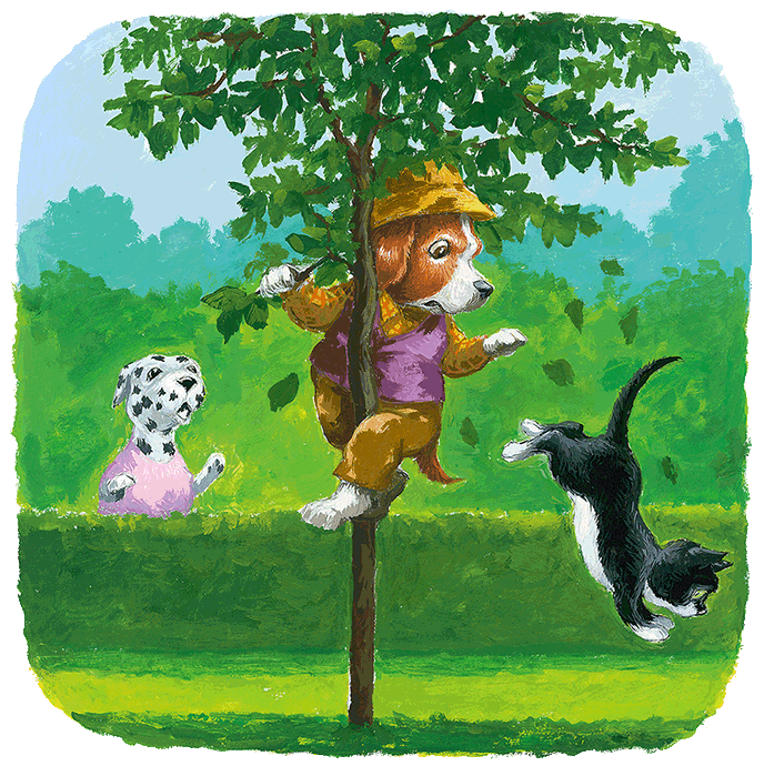 Артос не слушает Бабетку и прыгает всё выше. Ещё чуть-чуть – и схватит кошечку за хвост. Но кошка спрыгнула на землю – и бежать.