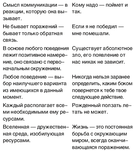 Когда я впервые услышал об этом упражнении, мне стало интересно: «На что похожи Антипресуппозиции НЛП, или Пресуппозиции антиНЛП?» Родился такой список: