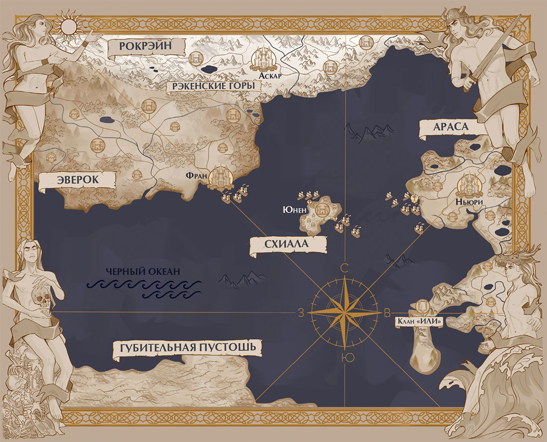 Раз в семь лет паломники съезжались в столицы своих стран и, принося дары к алтарям на главной площади, провожали закатное солнце, именуя этот день Началом новой жизни. Легенды гласили, что раньше мир был окутан тьмой, но на седьмую полную луну явился Всевидящий и озарил все вокруг ярким светом, подарив жизнь четырем олхи[1]. Святые поделили землю и создали людей, построили города и основали поселения. Так святой Ар, принявший облик дракона, покровитель ветра и Чёрного океана, создал на востоке Арасу. Святой Рэй, защитник богов и людей, сотворил на севере Рокрэйн. На западе обосновалась святая Эвер – покровительница света, – построив там Эверок. А четвертый олхи – Сэтил – повелевал тьмой, пожирающей грехи людей. Создав город в песках, он погубил весь свой народ, за что был лишен зрения и изгнан с небес. Говорят, что каждые семь лет в ночь перед праздником его озлобленный дух поглощает грешные людские души, не пуская их в новую жизнь. Эту ночь называют Зачисткой, и, чтобы избежать встречи с повелителем тьмы, после заката все прячутся по домам и шумно радуются грядущему семилетию.