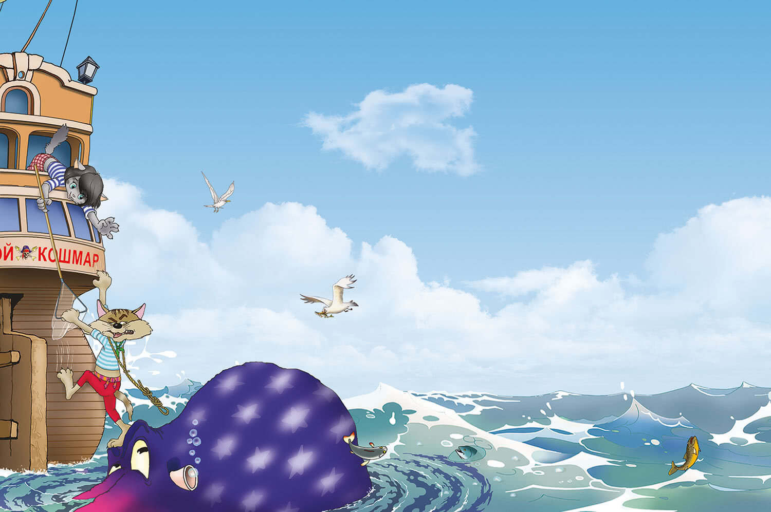Мыша подвывала от горя. Ее хрупкий мирок тоже кренился и даже слегка обрушился. Рыжей малышке казалось, если соблюдать нехитрые правила: не врать, не кусаться, помогать другим и не злиться, – вырастет невидимый купол, оберегающий от напастей. И вот – полюбуйтесь: гигантский кальмар, розовато-лиловый до тошноты, с противными сизыми присосками, нападает на их корабль в первый день ее путешествия! Да где вообще справедливость-то?!