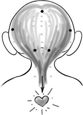 Я впервые увидела эту линию и существующие там точки с такой ясностью – они напоминали мне боевой раскрас индейцев. Теплые импульсы побежали из передних «козьих рожек» наверх и назад через их отражение сзади и через всю голову в ровную линию, которую хотелось назвать «саженью в плечах».