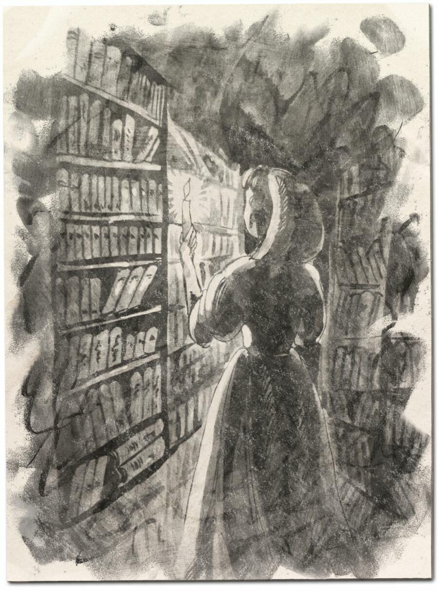 Вдруг она замерла. В темном углу зала мелькнула чья-то тень и скрылась за колонной. Неужели она здесь не одна? Испуганная девушка выскочила вон, немного постояла в коридоре, переводя дыхание, и задумалась. Стоит ли сегодня спускаться в библиотеку? Немного выждав и не заметив больше ничего подозрительного, Анжелика всё же направилась в подвал.
