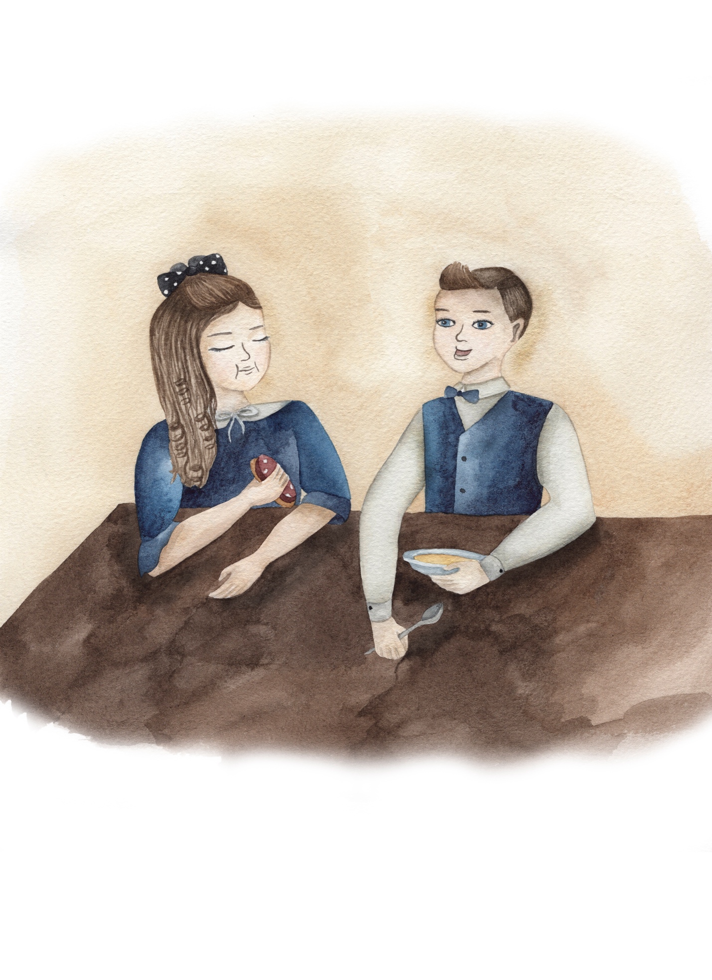 Вася взял суп себе, к сестре подсел.