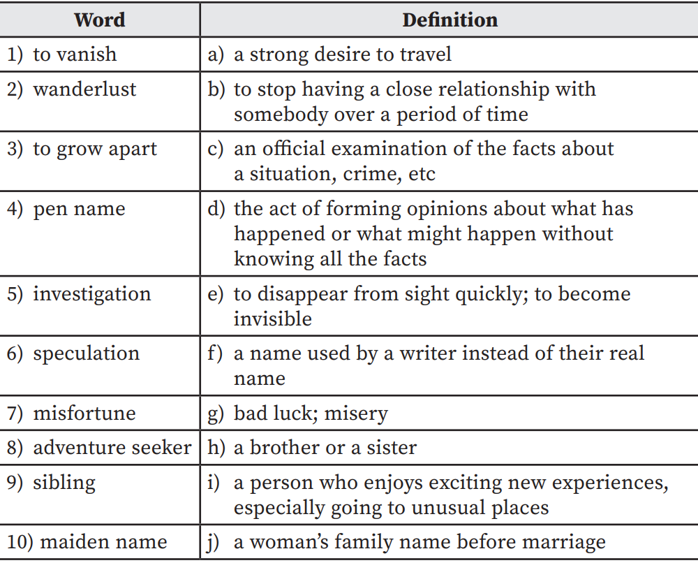 the world’s best-selling novelist; a cunning ploy; to go on a round-the-world trip; a true adventure seeker; to overcome all life’s challenges; over time; to vanish without a trace in suspicious circumstances; an hour’s ride from home; financial hardships; to pursue a career in music; a private person; to move on; siblings; to leave an imprint (on); a fierce argument; to be home schooled; to check into a hotel; military officer; natural shyness; to have a rich imagination; the world collapsed overnight; to prepare an escape plan; to come to a dead end; personal belongings