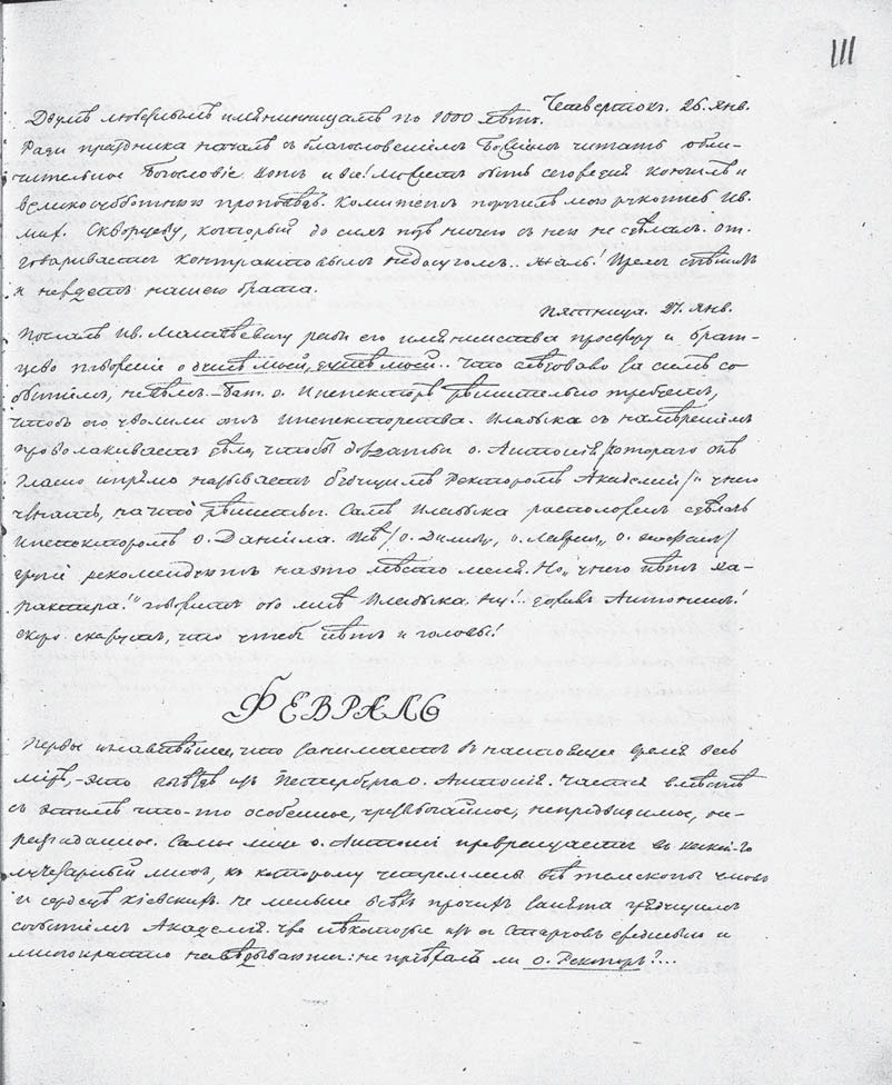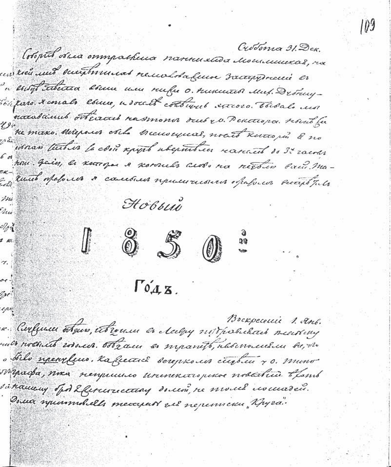Служили обедню и ездили в Лавру поздравлять Владыку{1} с Новым Годом. Обедали в трапезе и выполняли все, что было пренужно. Кажется, вечерком сидели у о. типографа, пока не пришло инспекторское повеление ехать нашему бродяжничеству домой, не томя лошадей. Дома приготовлял тетрадь для переписки «Круга»{2}.