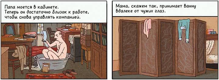 Она взяла шерстяной шарф и положила его на пол, чтобы яйцо выпало на него. Потом она села на корточки и начала тужиться. При этом она закудахтала, но яйцо не появилось. В конце концов, после очень долгого сидения, что-то выскочило – но не яйцо, а колбаска. Наконец Ева выросла и поняла, что женщины не откладывают яйца.