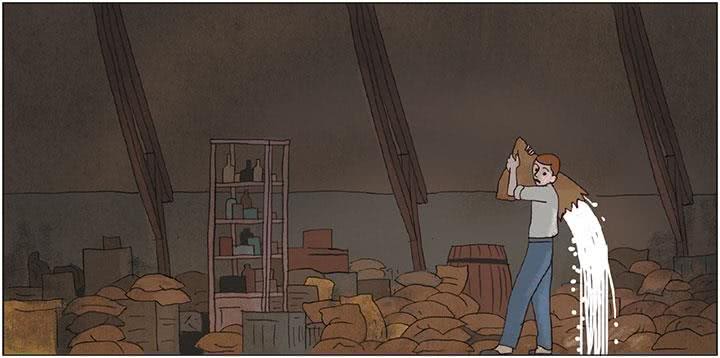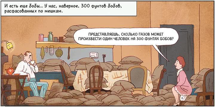 Но один из мешков порвался, и ливень, нет, град бобов обрушился по лестнице вниз! Грохот был, как на Страшном суде. Внизу, наверно, подумали, что старый дом со всем его содержимым валится им на голову.