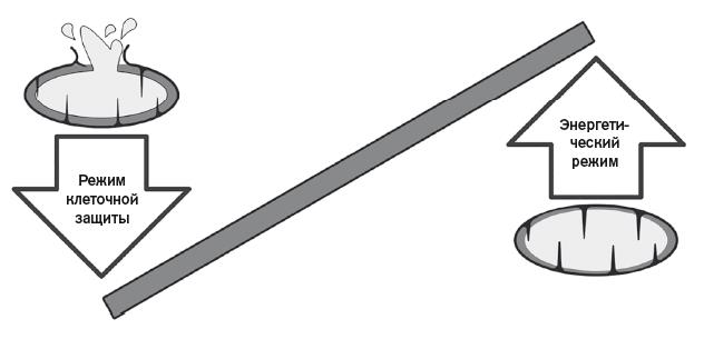 Митохондрии – это ось колеса метаболизма, они координируют более 500 различных химических реакций путем отслеживания и регулирования химической среды клетки. Оказывается, когда митохондрии обнаруживают «опасность» для клетки, они сначала переключаются в режим стресса, затем в боевой режим, который отключает большинство энерговырабатывающих функций в митохондриях… Выработка энергии и клеточная защита – это две стороны одной медали… Митохондрии не могут одновременно выполнять и энергетическую, и защитную функции на все сто процентов5.