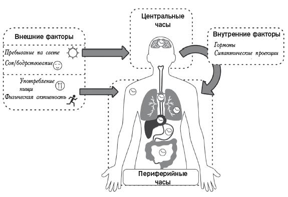 Цайтгеберы воздействуют на разные часы. Свет, например, является мощным цайтгебером для центральных часов в мозге, но никак не действует на другие часы, например в коже19. С другой стороны, употребление пищи – это сильный цайтгебер для пищеварительных органов, тех же печени и поджелудочной железы, но на главные часы он воздействует слабее20.