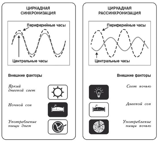Связь между внешним миром света и темноты и внутренним миром биохимии поддерживают наши циркадные часы, или циркадный ритм. Циркадный ритм состоит из двух частей18: