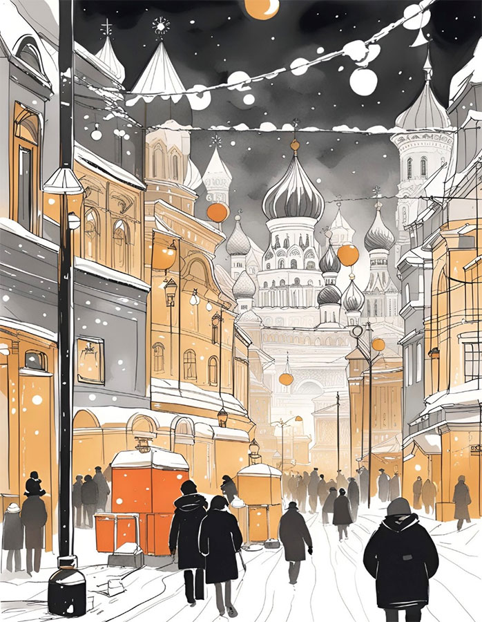 Длинным рядом выросли монументальные серые многоэтажки Нового Арбата, разделённые по обе стороны широким проспектом, в конце которого просматривались высотки Кутузовской цвета слоновой кости и стеклянные монолиты Москвы сити. Параллельно Новому шёл старый Арбат, создавая интересное смешение стилей – светлые фасады малоэтажных домиков с лепниной и лаконичная серость небоскребов играли на контрасте друг с другом. Деревья вдоль проспектов были богато украшены золотистыми и красными шарами, по просторным тротуарам сновали люди, а широкие многополосные дороги, подобно лавине, заполнял плотный поток автомобилей, грозно надвигающийся и быстро проносящийся мимо. Все куда-то спешили в этот солнечный день в декорациях щедро украшенного города, под ногами сотен сапог скрипел снег, слышался гомон голосов, а в воздухе повисло всеобщее радостное возбуждение.