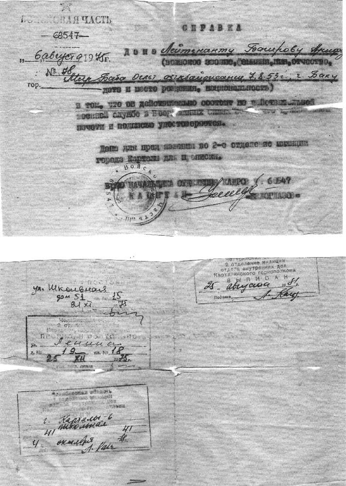 Изучая свои личные архивные документы по прохождению воинской службы после окончания Харьковского ВКИУ, я нашёл интересный документ, выданный отделением кадров дивизии 6 августа 1975 г., а именно справку для представления в отделение милиции г. Карталы для прописки.