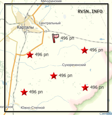 Схема позиционного района 496-го ракетного полка, где был зафиксирован НЛО. Флажком отмечен КП 496-го рп, совмещенный с позицией ПУ, над которой наблюдался НЛО.