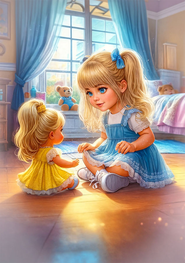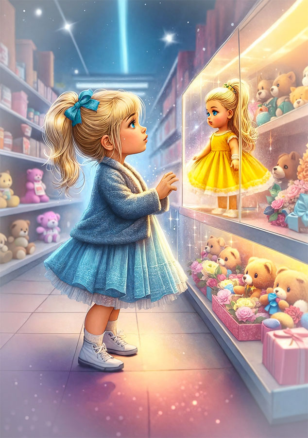 Магазин был и правда огромный! Большие эффектные куклы занимали всю стену, но одна из них была особенной – кукла Ляля. Когда Варя увидела её, так и застыла любуясь: коротенькое жёлтенькое платье, длинные золотистые волосы, голубые глаза – Ляля была очень похожа на Варюшу. Она стояла на самой высокой полке и была такой недосягаемой, что у Вари только сильнее разгоралось желание её получить. Но попросить маму она не могла, ведь у неё и так много кукол. Но эта была восхитительна…