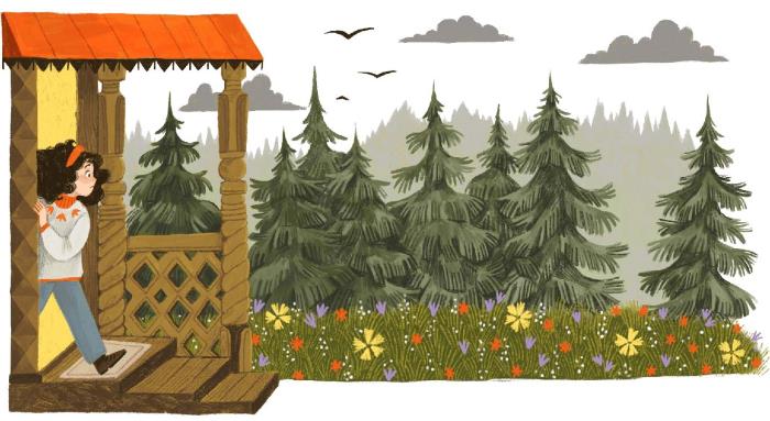 Вместо каморки, набитой старыми шубами и чемоданами, перед ней оказалась поляна в кольце густого леса. Под ногами у Вари лежал обыкновенный резиновый коврик, и три деревянные ступеньки вели вниз. Прямо от крыльца начиналась тропинка, протоптанная в высокой траве. Услышав позади стук, Варя обернулась. Дверь у неё за спиной захлопнулась, но стена, в которой была эта дверь, почему-то оказалась бревенчатой, и по сторонам виднелись окошки с белыми ставнями. Варя стояла на крыльце небольшого деревенского домика.