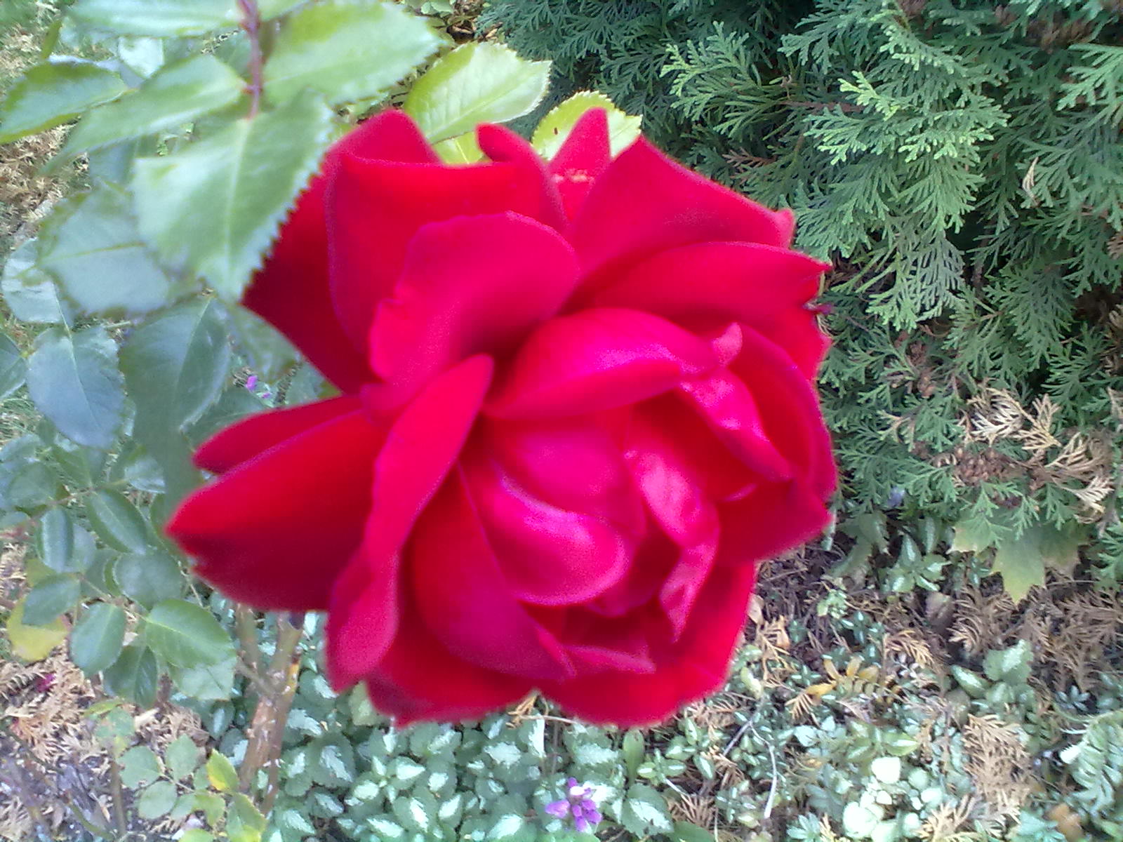 Наталья Сергеевна работает в храмовой канцелярии. Словно строй солдат, её охраняют высокие пышные туи. А у входа – шикарные розы, красная, и две розовые.