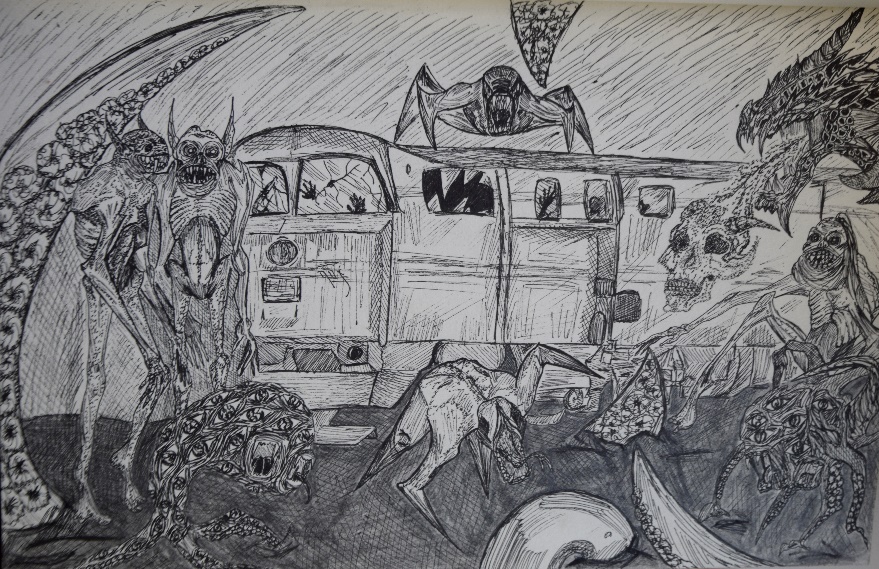 Прорыв землю, возвысились над всеми не менее ужасные существа. Лишенные обычного лица, они смотрели своим десятком глаз на электричку, выискивая жертв и хватая их своими щупальцеобразными черными конечностями. У самого начала поезда, кажется, показался дракон, который взмыл в небо на своих огромных крыльях и, светя своими яркими желтыми глазами, изверг из себя порцию адского пламени.