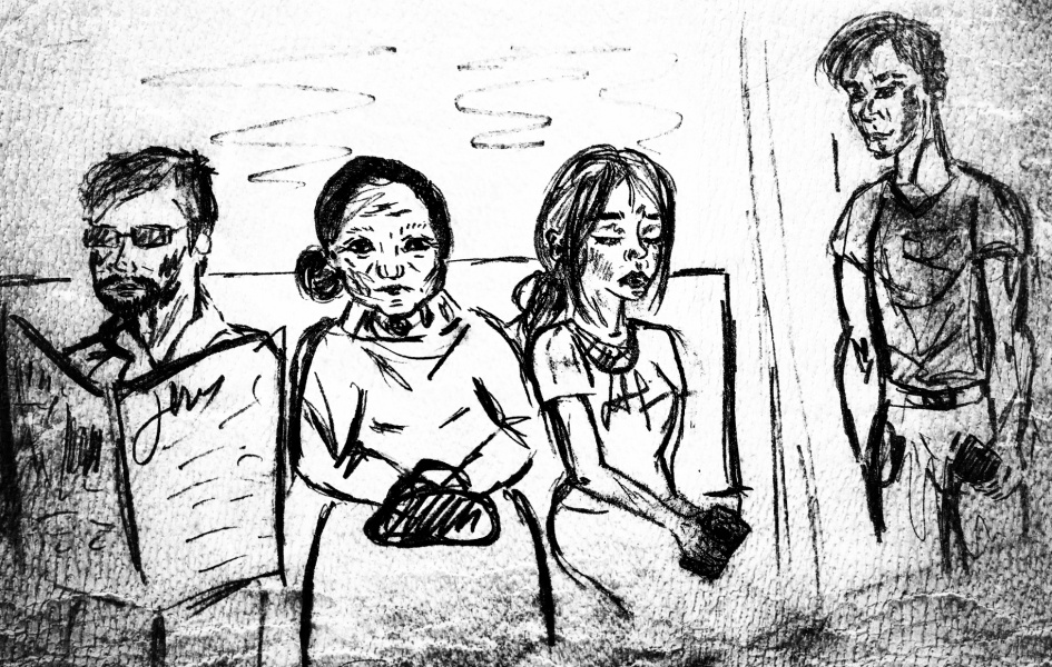 Вот немолодой мужчина в зеленой кофте с газетой в руках. Вот девушка современного типа: на ней красуются рваные джинсы, белая майка с непонятной надписью. В руках она держала куртку, наверняка, девушка шла прогуливаться по улице. Сейчас весна и вечерами не так тепло, как летом. Была и скучного вида женщина в платье, и парень в очках, неустанно поедающий глазами девушку в рваных джинсах, и бабушка с уставшим взглядом.