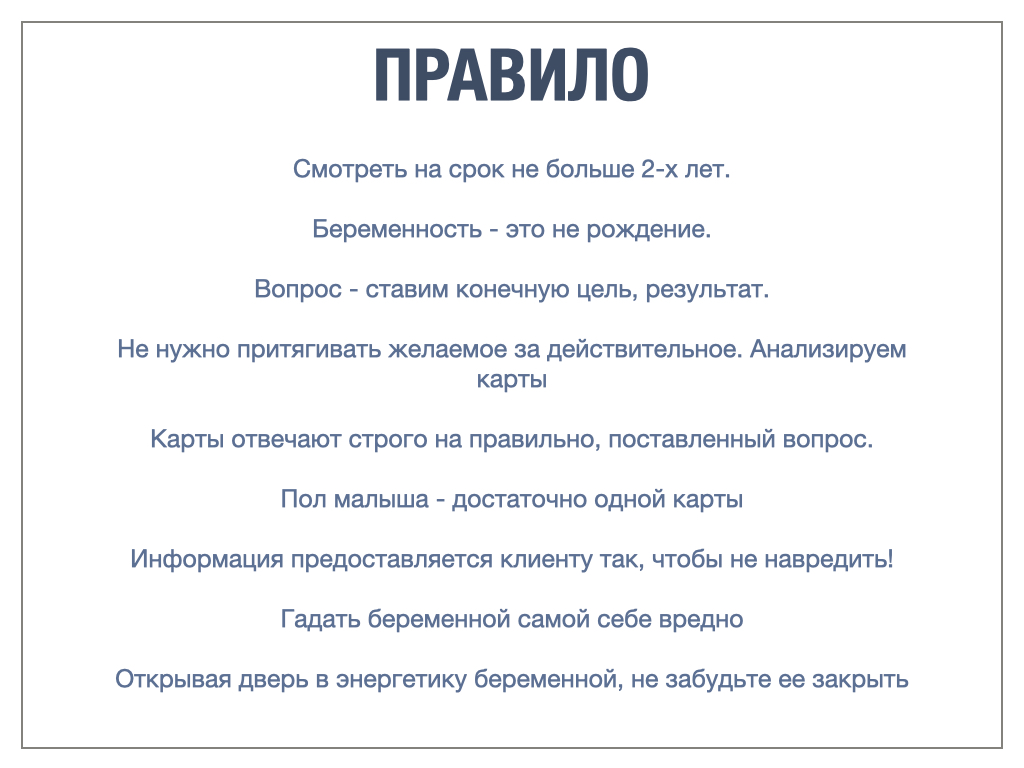 Как мы знаем карты разговаривают образно и ситуативно, и не будем забывать, что Аркан в переводе – это "тайна", какая-то часть реальных событий все равно будет скрыта, поэтому предсказать до точности какие-либо события мы не можем, это зависит от многих факторов: как ведет себя кверент после расклада; как он следует или не следует советам карт; много разных внешних обстоятельств, которые мы не можем увидеть, могут повлиять на ситуацию. Если бы мы просматривали все внешние обстоятельства человека, которые могут повлиять на ситуацию, мы бы месяц делали один расклад на одного человека, и то, до конца не смогли бы все просмотреть. Точность предсказания во многом также зависит от постановки вопроса, от рядом лежащих карт, от типа расклада и на сколько грамотно он был построен и еще много и много всего, понимаете, да? Поэтому, не имея собственного опыта, собираемого годами (сделали расклад, записали, зафиксировали, через месяц, год, два спросили обратную связь, снова записали и так с каждым клиентом и каждым раскладом), то предсказать в другой сфере, не в здоровье (специальной сфере которая отвечает за вопросы о рождении ребенка) – достаточно сложно и затруднительно. Все должно быть ПРАВИЛЬНО и тогда, вас будут ждать ПРАВИЛЬНЫЕ результаты.