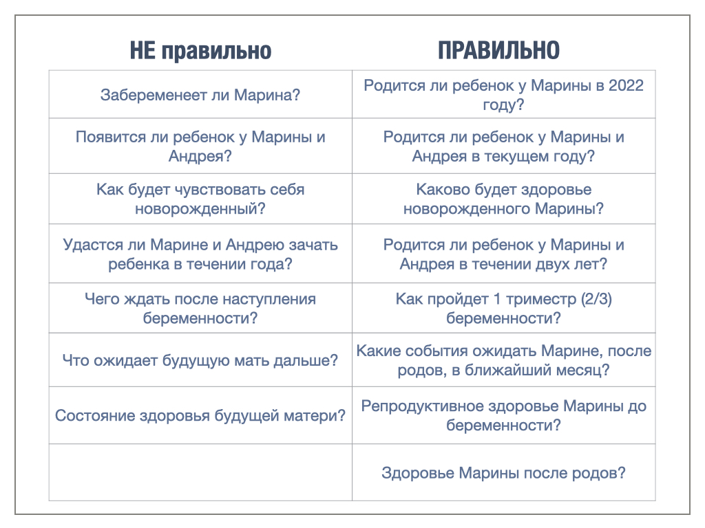 3. Вопросы правильно сформулированные: может ли женщина ожидать рождение ребенка в течении 2022 года? Является ли этот период благоприятный для женщины, чтобы забеременеть или родить? По какой причине не получается сохранить беременность или зачать ребенка? Есть ли проблемы у женщины/мужчины, связанные с репродуктивной системой? Произошло ли зачатие на данный момент? Как будет протекать беременность в первый или второй, третий триместр? Как будут протекать роды? Каково будет здоровье матери после родов? Каково будет здоровье новорожденного? И т.п.
