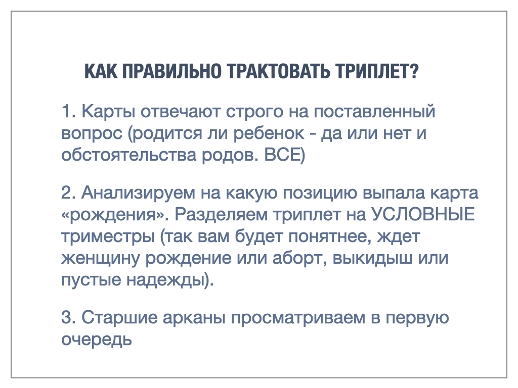 1. Вы должны понимать тот факт, что на триплете не всегда можно увидеть много деталей этого события. На быстром раскладе карты ответят только на один поставленный вопрос. Не нужно рассказывать, как пройдет беременность, как пройдут роды, ее поход в магазин, отношения с мужем и т.д. если ваш вопрос звучал так: "родится ли ребенок в таком-то году". Вообще вопросы на триплете лучше задавать только про рождение. Если вас интересует есть ли зачатие на данный момент у женщины, то тут лучше вытянуть всего лишь одну карту, её будет вполне достаточно.