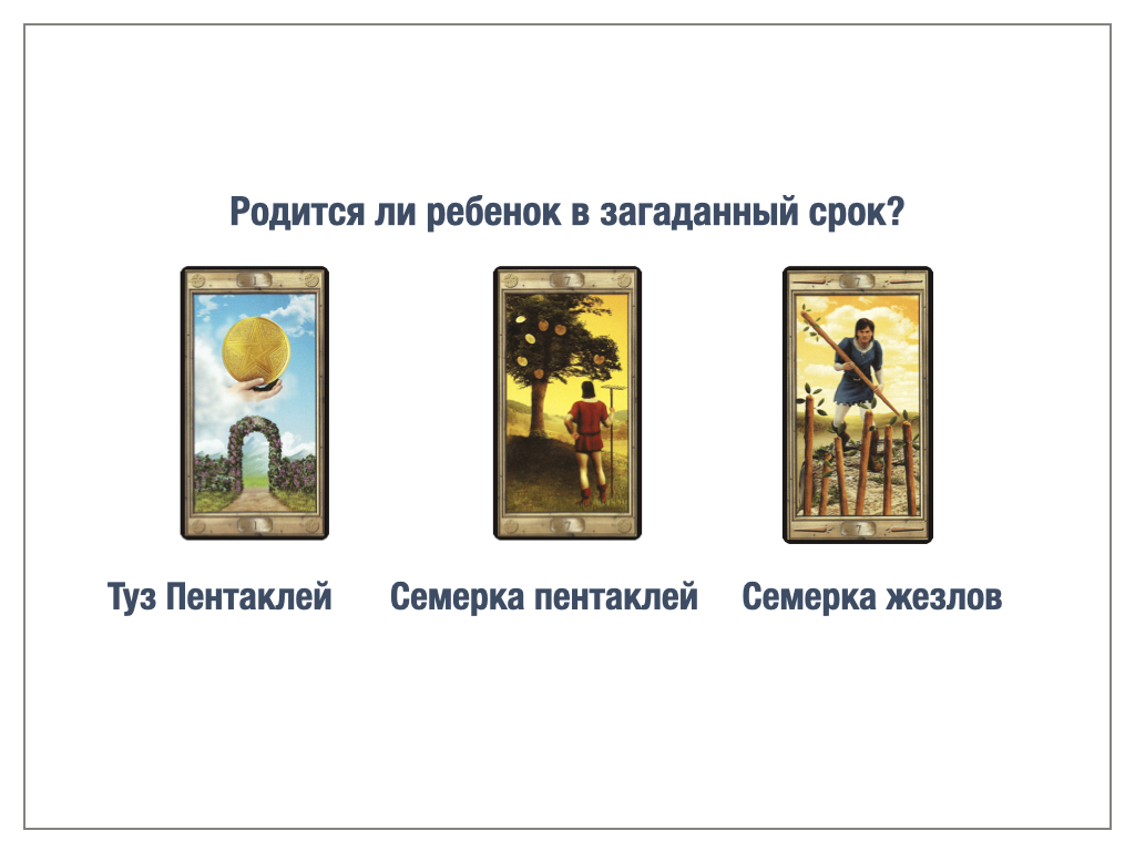 Например, на вопрос: "родится ли ребенок" вам выпадает туз пентаклей, семерка пентаклей и семерка жезлов. Многие тарологи здесь совершают глубокую ошибку, видя туз пентаклей они смело отвечают да. Но если даже представить на секунду тот факт, что туз пентаклей говорит о зачатии, то он не говорит о рождении. На такой вопрос должна выпасть карта именно рождения ребенка. Если такой карты не выпало, то не стоит обнадеживать клиента, в лучшем случае вы можете сказать: «я не могу просмотреть вашу ситуацию на трех картах, обратитесь ко мне на полный расклад», в худшем случае так и сказать: «вам выпадает карта зачатия, но не падает карта рождения, обратитесь ко мне на полный расклад, чтобы я могла более детально просмотреть вашу ситуацию». Тогда вы будете честны с клиентом, вы не будете просто так обнадеживать, и, если клиент обратится, вы сможете его сохранить и сказать более точную информацию.