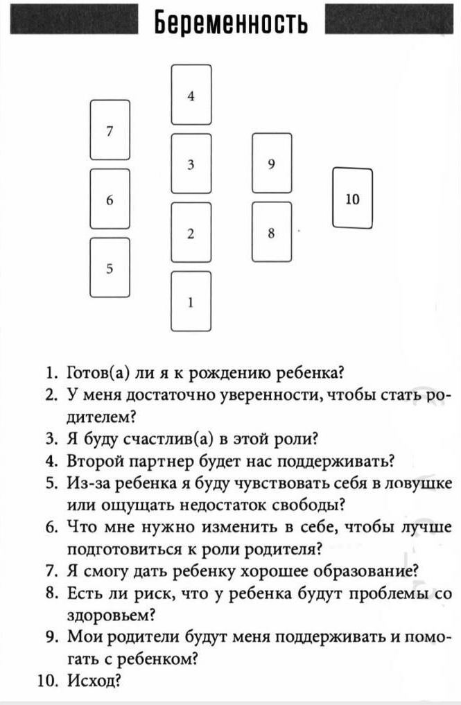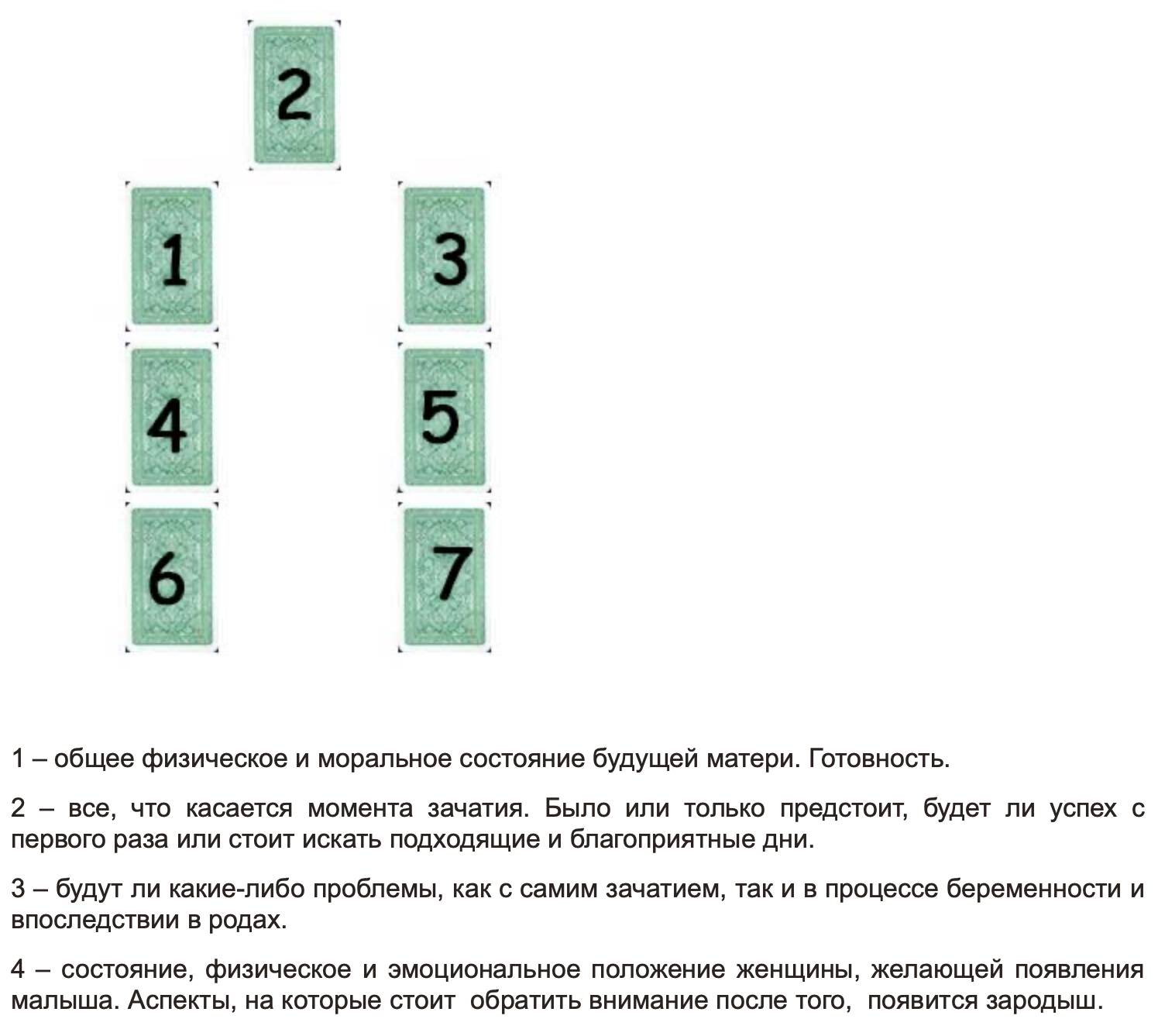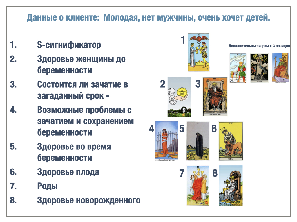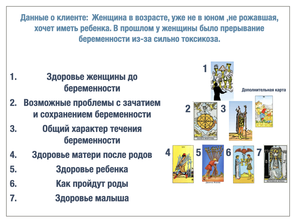 Хороших схем раскладов на беременность, как мы уже с вами поняли – не так и много. В основном они все сходятся к одним и тем же позициям: было ли зачатие, как пройдет беременность, роды, здоровье ребенка, здоровье матери. Сейчас мы разберем с вами расклады, которые реально были использованы для клиента, а потом приступим к знакомству и изучению моих авторских раскладов.