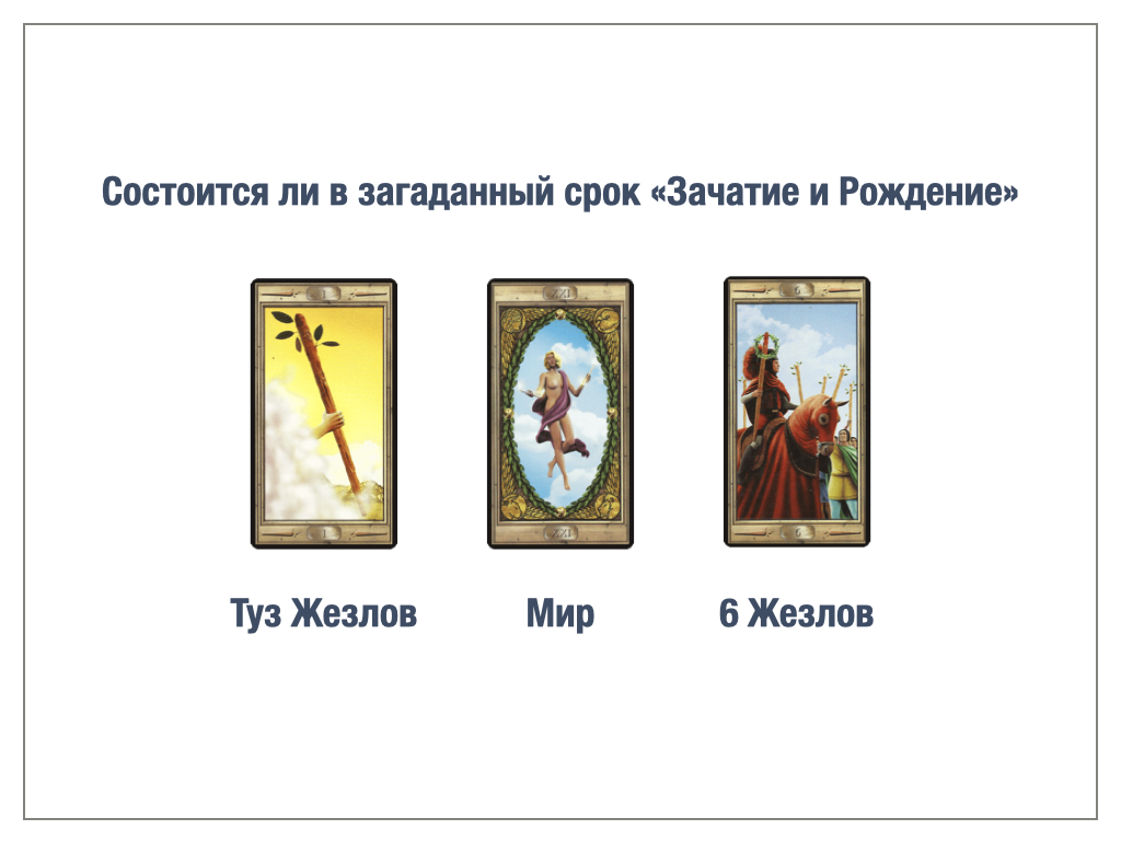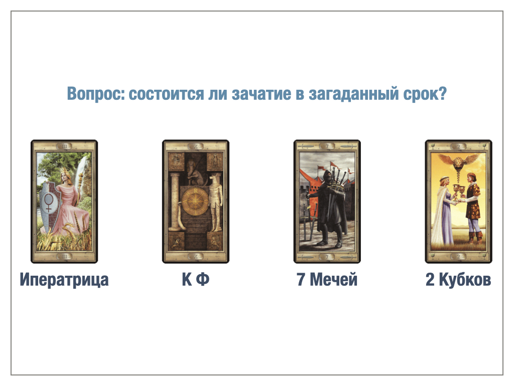 1. Я бы не рекомендовала делать такой расклад. Потому что такие расклады путают тарологов. А именно, у девушки выпадает на вопрос: «Состоится ли зачатие в загаданный срок?» карта Император, ее он смутил (и правильно, что смутил), она достает еще три карты (хотя, достаточно и одной дополнительной карты): Пятерка Мечей, Башня, Король Жезлов.