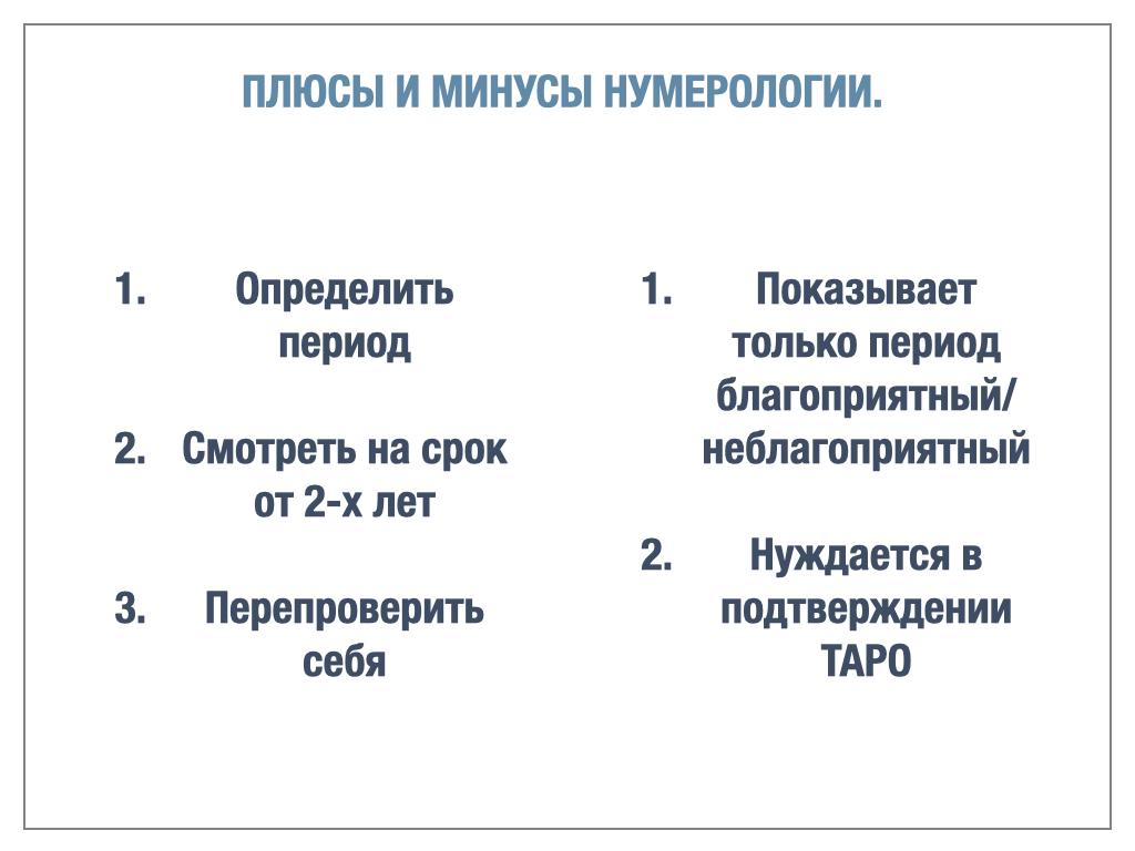 Плюсы и минусы нумерологии. Плюсы в том, что к примеру женщина не знает на какой год, она хочет посмотреть рождение ребенка и мы можем просмотреть все ее ближайшие года, вплоть на 30 лет вперед, и увидев благоприятный год, мы можем на Таро его просмотреть. Второй плюс – это то, что смотреть можно на срок от двух лет. А также перепроверить свой расклад.