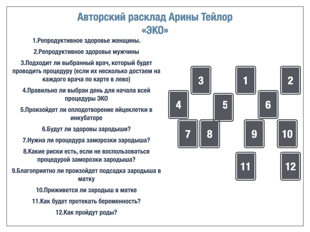 На ЭКО нужно делать специальный расклад, его нужно делать тогда, когда уже известно, что женщина собирается делать ЭКО.