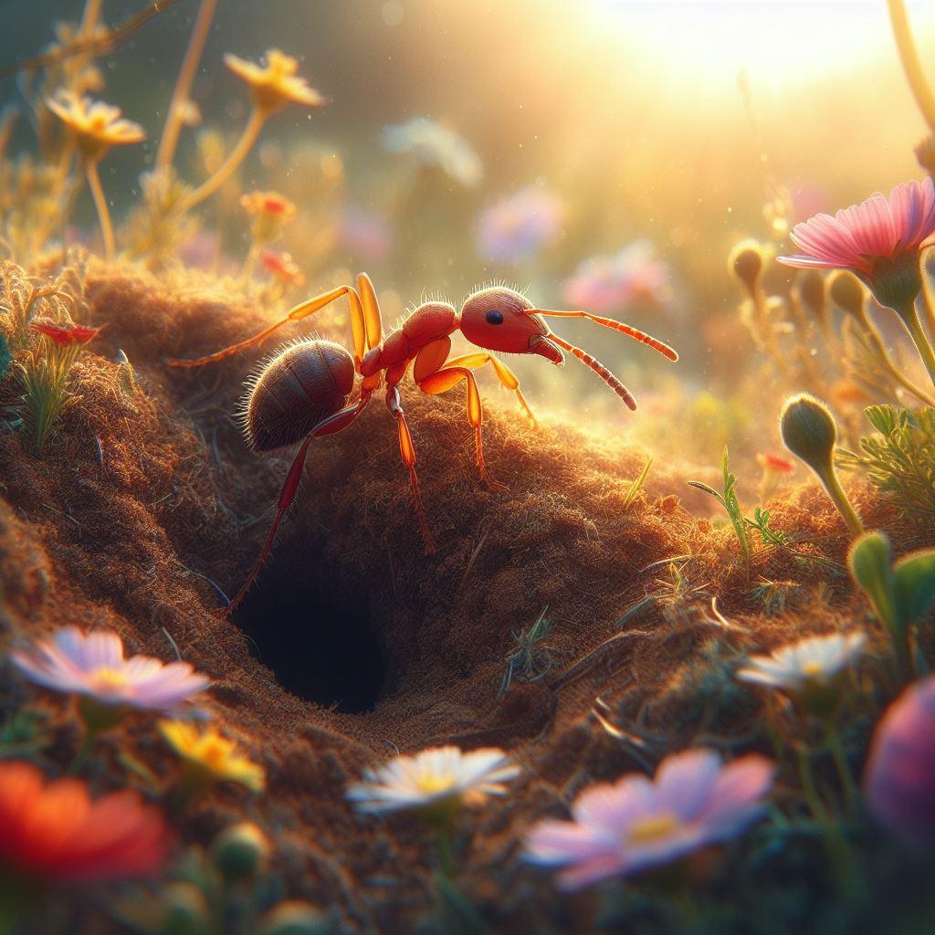 Как только первые лучи солнца пробились через кроны деревьев, озаряя муравейник тёплым светом, Мартин, полный решимости и волнения, уже стоял у входа в муравейник. Он взглянул на спящий муравейник, где все его друзья и семья ещё спали, и шепотом произнёс:
