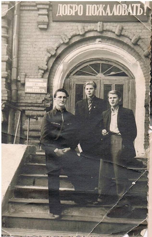 На ступеньках у входа в техникум я слева. Рядом мой земляк с Украины Петя Приходько. На мне одежда Урмана, лучшего тогда портного Немирова.
