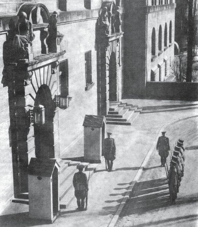 Один из подъездов Дворца юстиции. На караул встают советские солдаты.