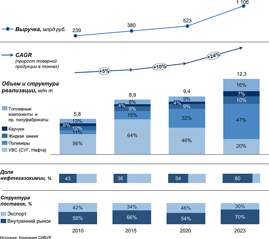 Начиная со второй половины нулевых, наряду с ростом выручки и повышением эффективности работы компании в прежнем периметре деятельности, в СИБУРе было развернуто целенаправленное и планомерное строительство новых мощностей по производству, в первую очередь, базовых полимеров (наряду с продажей активов, становившихся для компании не профильными). В результате в 2011–2023 гг. компании удалось значительно снизить поставку на рынок углеводородного сырья при значительном наращивании его переработки на своих мощностях с выпуском продукции нефтегазохимии, доведя ее объем до 80 процентов от всего объема выпускаемой продукции. В 2023 г. объем реализуемой продукции компании превысил 1 трлн рублей, а в натуральном выражении – 12 млн тонн (более 70 процентов общероссийского производства). В результате за 2011–2023 гг. ежегодный темп прироста ее производства составил 11 процентов.