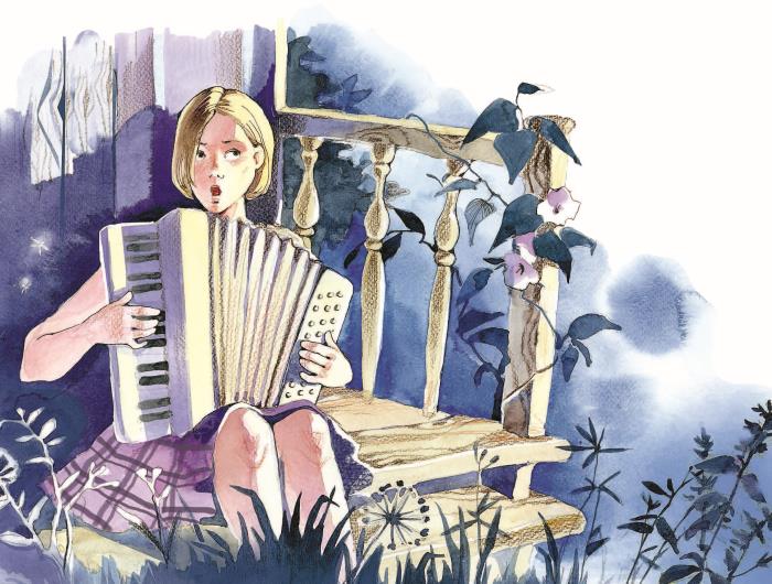 В сумерки, когда уборка была закончена, Ольга вышла на крыльцо. Тут из кожаного футляра бережно достала она белый, сверкающий перламутром аккордеон – подарок отца, который он прислал ей ко дню рождения.