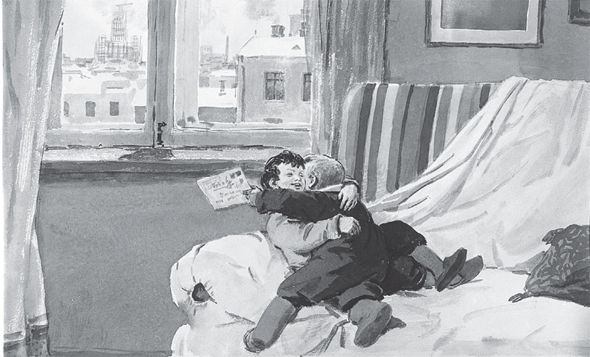 И так они говорили долго, размахивали руками, притопывали, подпрыгивали, а мать сидела молча, всё их слушала, слушала. Наконец рассмеялась, схватила обоих на руки, завертела и свалила на диван.