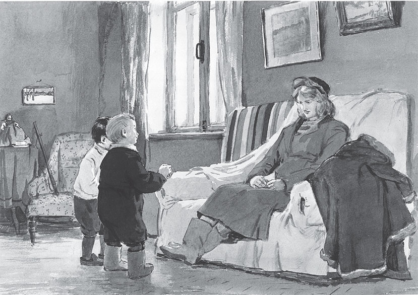 И только что они на этом порешили, как вошла мать. Она была довольна, потому что достала хорошие билеты на поезд, но всё же она сразу заметила, что у её дорогих сыновей лица печальные, а глаза заплаканы.