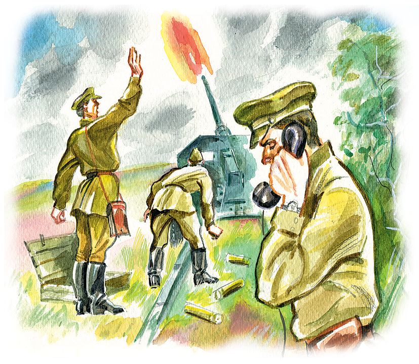 Но тут красноармейский командир, который стоял позади с телефонной трубкой, что-то громко закричал. Другой командир, который стоял поближе к пушке, тоже что-то крикнул, махнул рукой, и тогда красноармеец дёрнул за шнурок.
