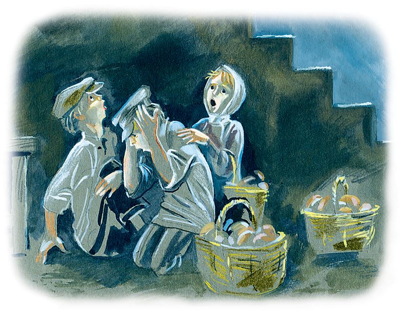 Вскоре ребята наткнулись на какой-то погреб. Дверь в погреб была приоткрыта. С робостью спустились они по каменным ступенькам и очутились в глубоком каменном подвале, куда едва доходил слабый дневной свет.