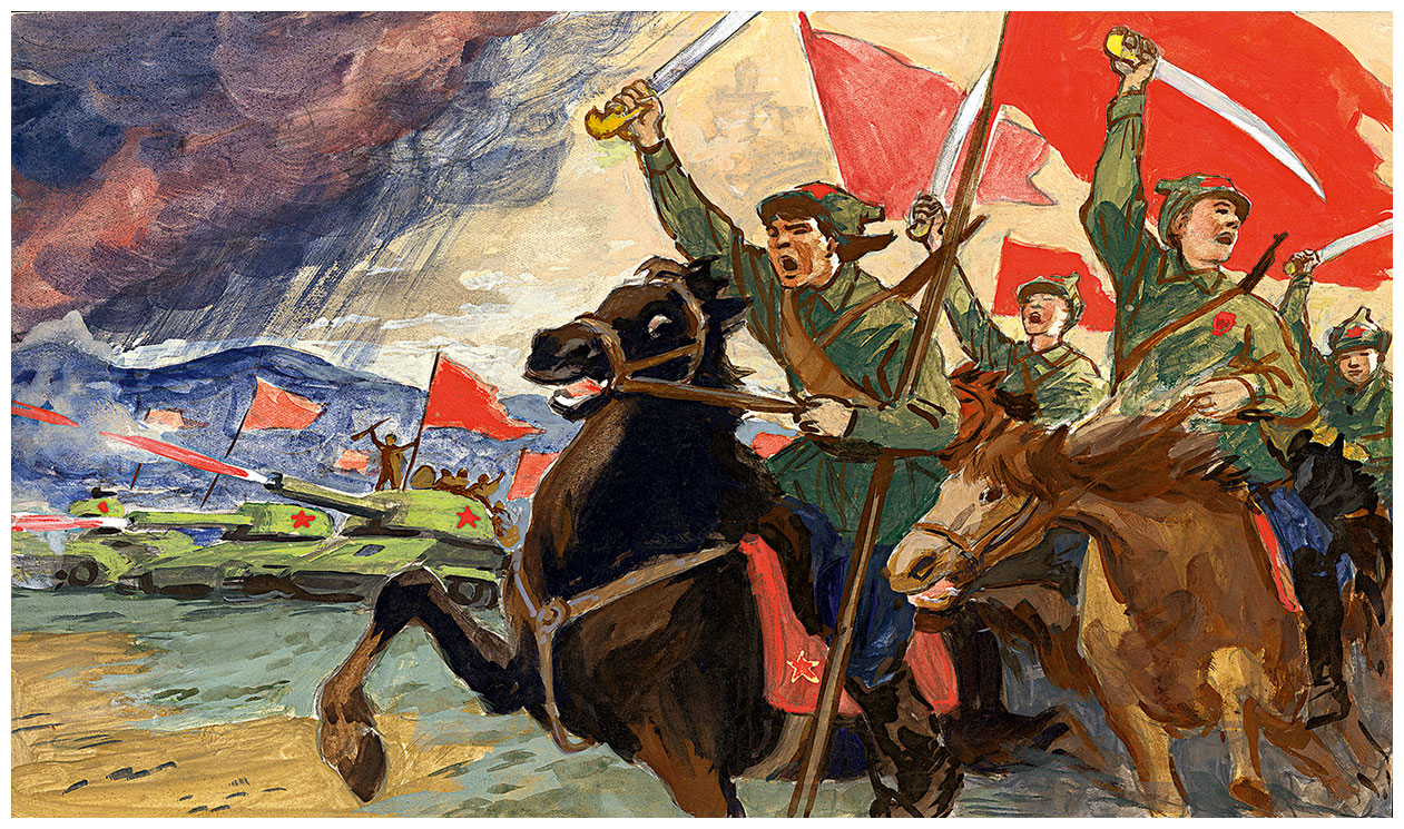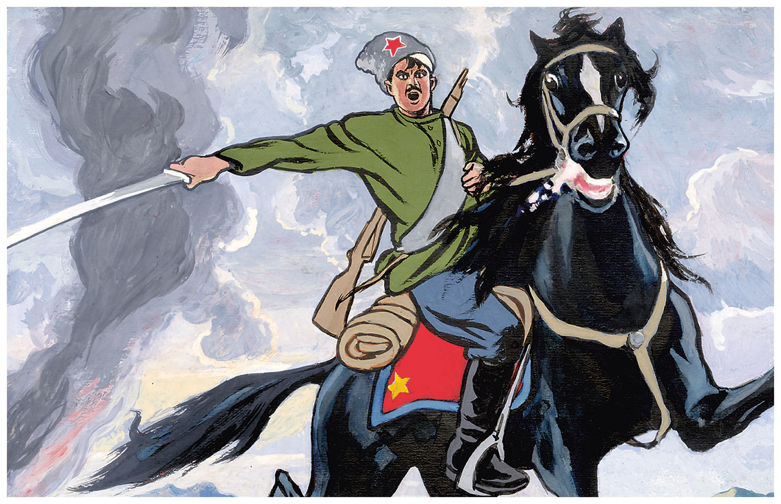 – Эй, вставайте! – крикнул всадник. – Пришла беда, откуда не ждали. Напал на нас из-за Чёрных Гор проклятый буржуин. Опять уже свистят пули, опять уже рвутся снаряды. Бьются с буржуинами наши отряды, и мчатся гонцы звать на помощь далёкую Красную Армию.