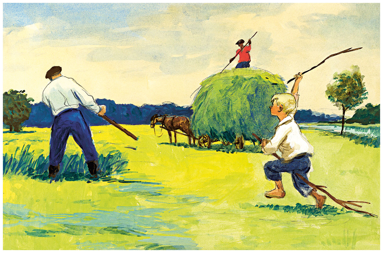 Отец работает – сено косит. Брат работает – сено возит. Да и сам Мальчиш то отцу, то брату помогает или просто с другими мальчишами прыгает да балуется.
