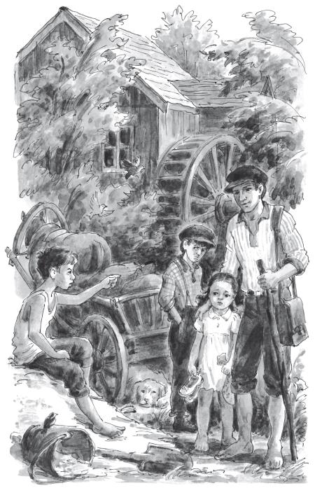 И только хотел я это сказать, как вдруг дрогнула и зашумела мельница, закрутилось по воде отдохнувшее колесо. Выскочила из мельничного окна обсыпанная мукой, ошалелая от испуга кошка. Спросонок промахнулась и свалилась прямо на спину задремавшему Шарику. Шарик взвизгнул и подпрыгнул. Кошка метнулась на дерево, воробьи с дерева на крышу. Лошадь вскинула морду и дёрнула телегу. А из сарая выглянул какой-то лохматый, серый от муки дядька и, не разобравшись, погрозил длинным кнутом отскочившему от телеги Саньке: