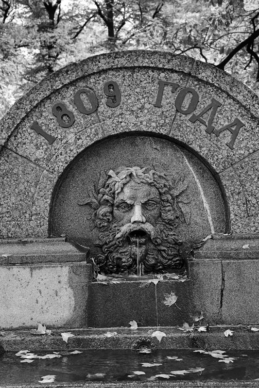 Сказочность апельсинщины-итальянщины садику придает чудный фонтан-поилка – ну чистая гоцциева фантазия, – сооруженный из массивных гранитных глыб, с грубой бородатой физиономией некоего речного божества, выплевывающего воду в гранитное корыто, и надписью «1809 ГОДА» вокруг, что для Петербурга указует на седую древность. В русском восприятии фонтан – некое излишество, предмет роскоши; фонтан для русских – чистая декорация и должен бить вверх. Этот же, творение Тома де Томона, некогда украшавшее Царскосельскую дорогу, возвращает фонтану его первоначальный и истинный смысл – это источник, им можно пользоваться, – и в жару в гранитных корытах так приятно обмыть лицо, и наступает минутное облегчение, выплюнутая богом реки вода кажется даже чистой, хотя это иллюзия, это обычная водопроводная петербургская вода из ржавых труб, а никакая не римская, спускающаяся с гор по акведукам.