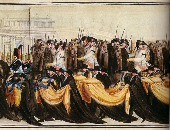 Здесь Блакац = император «Священной Римской империи германской нации», Карл «VI» (1685—1740 годы), после смерти которого началась «Война за Австрийское наследство». Сорделло упомянул «Священную Римскую империю германской нации», доставшейся Марии Терезии, баварского курфюрста Карла Альбрехта, чтимого германцами, первого кандидата на престол империи, даже коронованного, но рано умершего, короля Франции Людовика «XV», претендующего и на трон Испании (Кастилии), который занимал Филипп «V», герцог Анжуйский, короля Англии Георга «II», воевавшего «за ухо Дженкинса» с Испанией и участвующих в войне графов Тулузы, Прованса и Арагона. Милан в этой войне переходил из рук в руки. Мать, которая била королей Испании и Франции в союзе с королём Англии, – Мария Терезия, ставшая по итогам войны полноправной императрицей «Священной Римской империи германской нации»