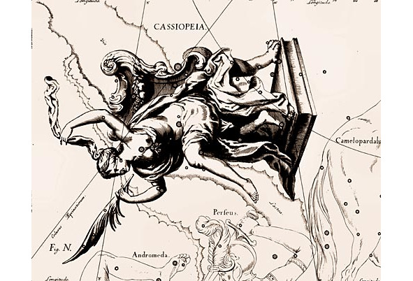 А. IX.1 Cозвездие Кассиопея (CASSIOPEIA) из Атласа «Uranographia» Яна Гевелия 1690 года. Созвездие Кассиопея лежит непосредственно на Млечном Пути (Via Lactea). Выше созвездие Цефей (муж Кассиопеи), не попавшее на иллюстрацию. Внизу созвездие Андромеда (Andromeda – дочь Цефея и Кассиопеи), созвездие Персея (Perseus – жених Андромеды) в шлеме с пером и c мечом в руке. Справа созвездие Жираф (Camelopardalus). Жена фантастически богатого царя Цефея – Кассиопея изображена в богатой одежде, головном уборе с пером в руке, которое она собирается пристроить в причёску, восседающей на царском троне с львиными ножками. Спинка кресла изображена в виде царского герба – щита.