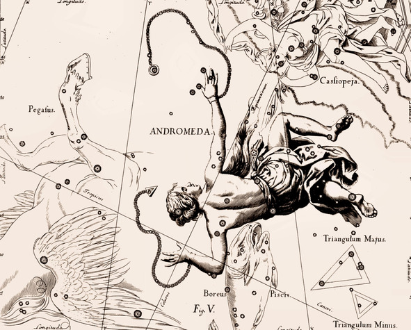 Пояснения к иллюстрации. Вверху справа созвездие Кассиопея (Cassiopeja – мать Андромеды). Слева созвездие Пегас (Pegasus – крылатый Конь). Внизу Северная Рыба (Boreus Piscis) из созвездия Рыбы, созвездие Большой Треугольник (Triangulum Majus) и созвездие Малый Треугольник (Triangulum Minus). Царевна Андромеда (дочь Цефея и Кассиопеи) изображена прикованной цепями. Согласно мифа, её приковывают к скале, чтобы принести в жертву Дракону. От гибели в пасти Дракона её спасает царевич Персей (на иллюстрацию не попадает), прилетевший на крылатом коне Пегасе. Он убивает Дракона и освобождает Андромеду. Но свадьбе не суждено состояться, на Персея нападают женихи Андромеды, он побеждает их только с помощью Головы Медузы Горгоны, которую держит в руках. Даже отрубленная, Голова обращает в камень любого, кто на неё посмотрит.