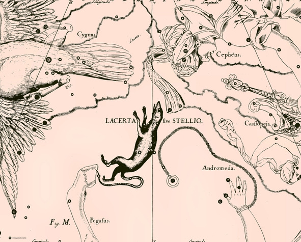 Пояснения к иллюстрации. Вверху слева созвездие Лебедь (Cygnus) на Млечном Пути (Via Lactea), справа созвездие Цефей (Cepheus), в богатой чалме с короной и скипетром в руках. Справа созвездие Кассиопея (Cassiopeja – жена Цефея). Внизу созвездие Пегас (Pegasus – крылатый Конь) и созвездие Андромеда (Andromeda – дочь Цефея и Кассиопеи). Ящерица изображена Гевелием в виде зверька, похожего на крысу, как будто он не знает, как выглядит ящерица.